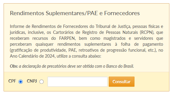 A Diretoria de Economia e Finanças do Tribunal de Justiça da Paraíba, por meio da Gerência de Finanças e Contabilidade, está disponibilizando informes de rendimentos para os(as) magistrados(as) e os(as) servidores(as) que receberam rendimentos suplementares à folha de pagamento, como, por exemplo, parcela autônoma de equivalência, gratificação de produtividade, progressão funcional, verbas rescisórias e abonos previdenciários, dentre outros, no ano de 2024, por meio do link: https://www.tjpb.jus.br/servicos/imposto-de-renda.