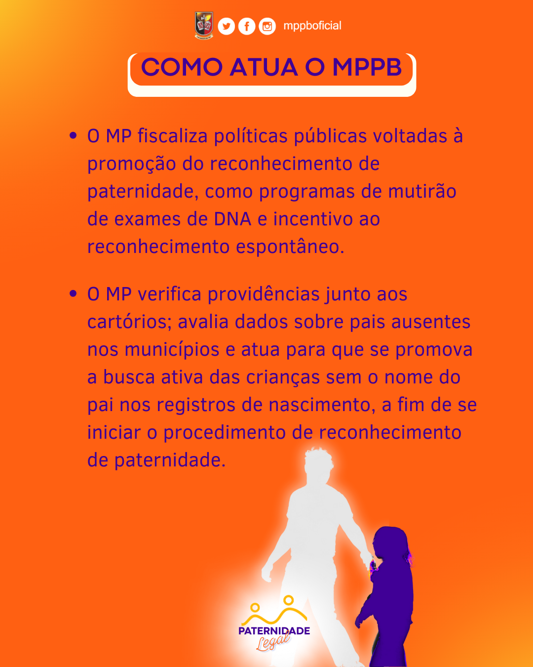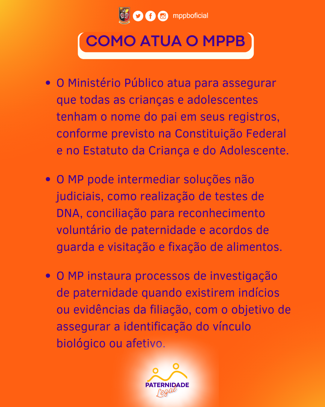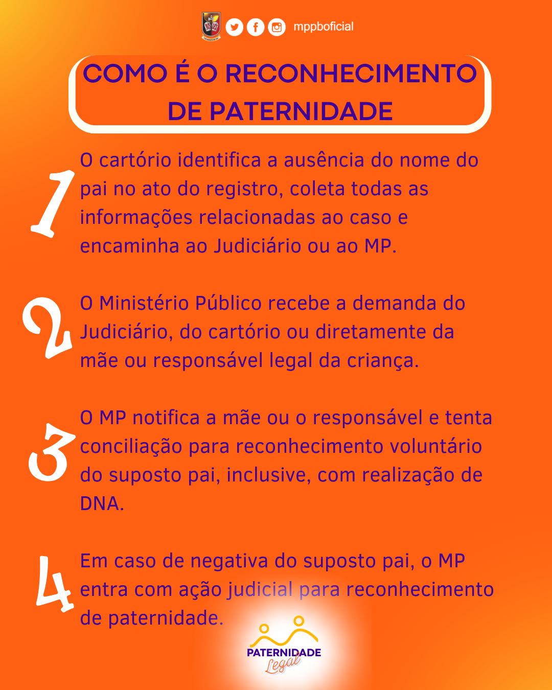 - Em caso de negativa do suposto pai para o reconhecimento da paternidade, o MPPB ingressa com ação judicial de reconhecimento de paternidade;