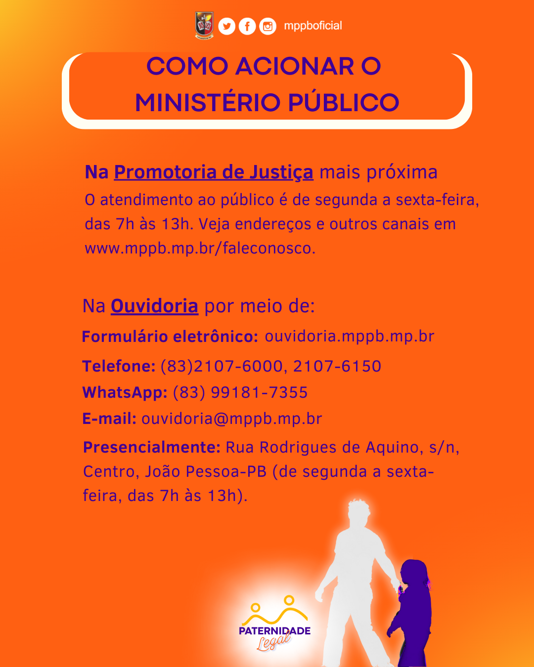- Para acionar a Promotoria de Justiça, utilize um dos canais do MPPB em www.mppb.mp.br/faleconosco.