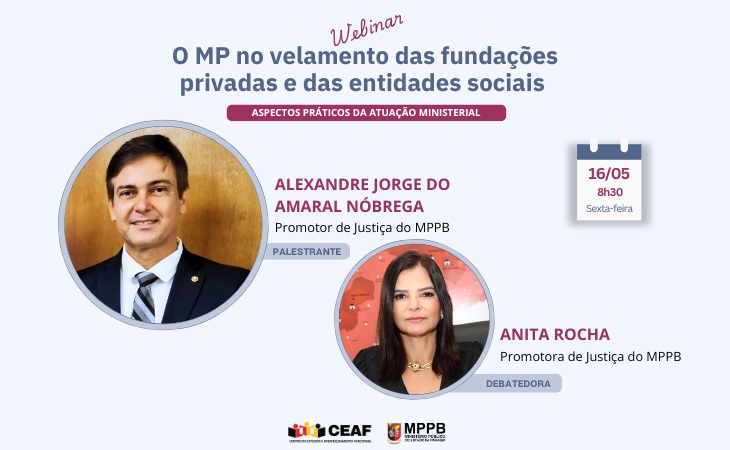 O evento é destinado exclusivamente aos membros do Ministério Público da Paraíba e terá como palestrante o 40º promotor de Justiça de João Pessoa, Alexandre Jorge do Amaral Nóbrega, que atua no velamento das fundações e é vice-presidente da Associação Nacional de Procuradores e Promotores de Justiça de Fundações e Entidades de Interesse Social (Profis). A debatedora será a promotora de Justiça e coordenadora do Ceaf, Anita Bethânia Silva Rocha.
