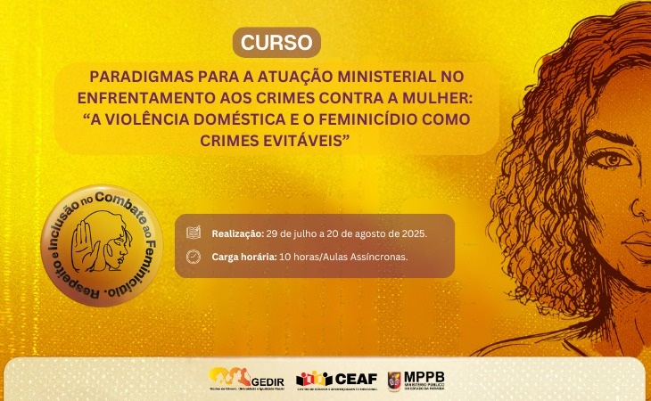 O Ministério Público da Paraíba, por meio do Centro de Estudos e Aperfeiçoamento Funcional (Ceaf), vai promover o curso “Paradigmas para a atuação ministerial no enfrentamento aos crimes contra a mulher: a violência doméstica e o feminicídio como crimes evitáveis”.