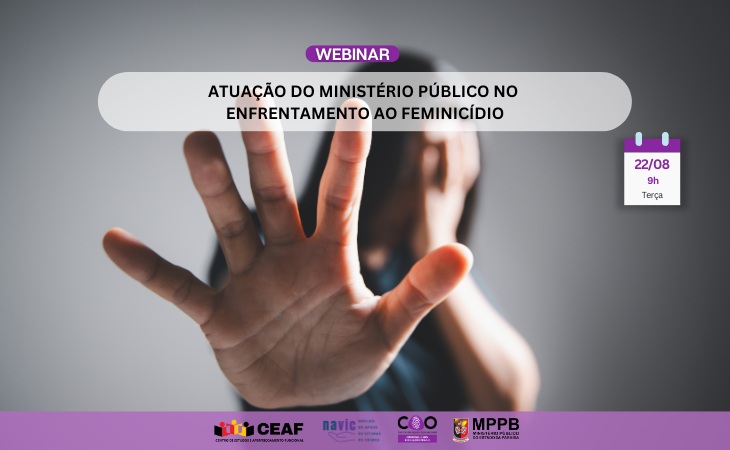 O Ministério Público da Paraíba realizará, no dia 22 de agosto, a partir das 9h, o webinar “Atuação do Ministério Público no Enfrentamento ao Feminicídio”, com o objetivo de aprimorar a atuação no combate ao feminicídio. O evento é promovido pelo Centro de Apoio Operacional em Matéria Criminal (CAOCrim), em parceria com o Centro de Estudos e Aperfeiçoamento Funcional (Ceaf).