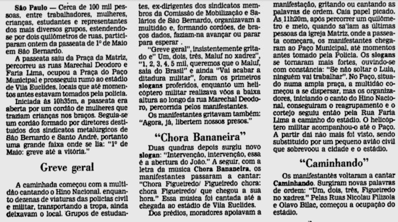 “Chora Figueiredo, Figueiredo Chora”: notas publicadas no Jornal do Brasil, à época, descrevem os “slogans” cantados no ato pelos manifestantes.Reprodução/Jornal do Brasil